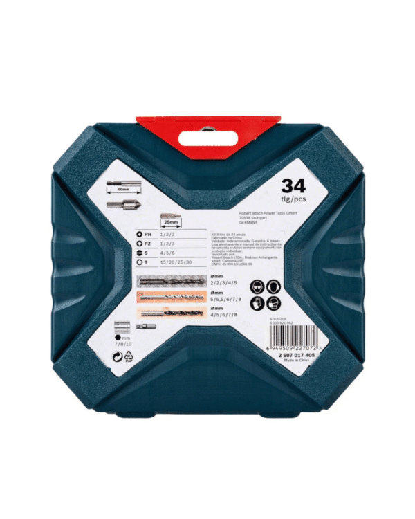 O jogo inclui 34 peças essenciais, compostas de bits de aparafusamento e brocas para perfuração em madeira, metal e plástico. Independente do material ou da complexidade da tarefa, ele garante um ótimo desempenho graças à engenharia de ponta da BOSCH. As brocas são fabricadas com materiais resistentes, proporcionando precisão e longevidade, enquanto os bits permitem um ajuste perfeito e seguro para parafusos de diferentes tamanhos e formatos.